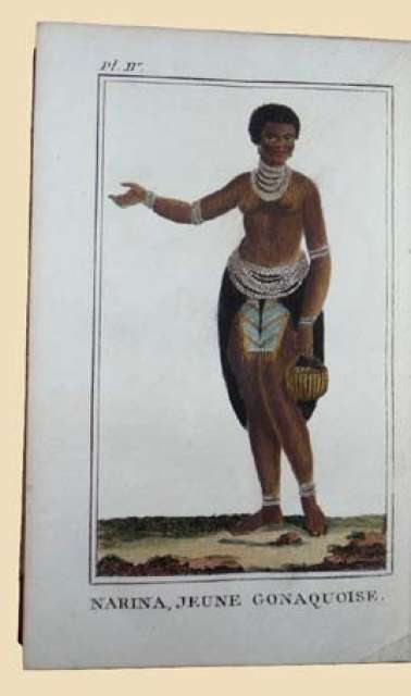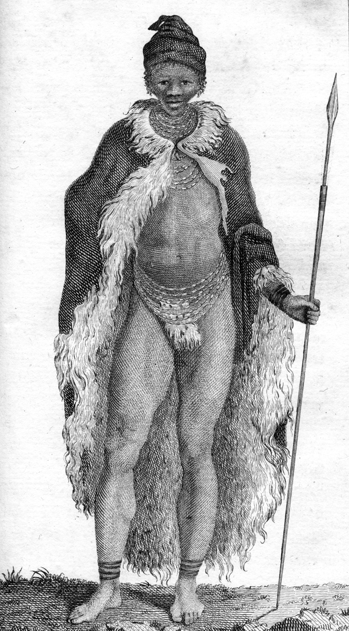 In quitting the Cape, Klaas had been recommended to me, by Mr. Boers, as a man whose courage and fidelity might be depended on; he ordered him never to abandon me, promising a recompense if I returned safe to the Cape, and gave a satisfactory account of his conduct; he faithfully obeyed these orders, never quitting me in the hour of danger. . . . Klaas was now my equal, my brother, the confidant of my hopes and fears; more than once has he calmed my agitated mind, and re-animated my drooping courage. . . . I did not forget to draw a faithful resemblance of this worthy Hottentot, from which the annexed plate was engraved. [Vol. 1, pp. 250, 252-53]